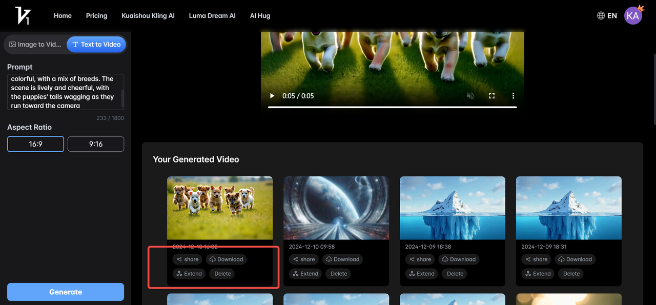 When describing a video, ensure your prompt is detailed and precise rather than too simple. For example, if you want to create a video of 'a group of puppies running,' avoid inputting just 'a group of puppies running.' Instead, use a more descriptive prompt like :'A group of playful puppies running together in an open grassy field on a sunny day. Their fur is soft and colorful, with a mix of breeds. The scene is lively and cheerful, with the puppies' tails wagging as they run toward the camera. 'The top video represents a simple description, while the bottom video showcases the result of a detailed and accurate description.
